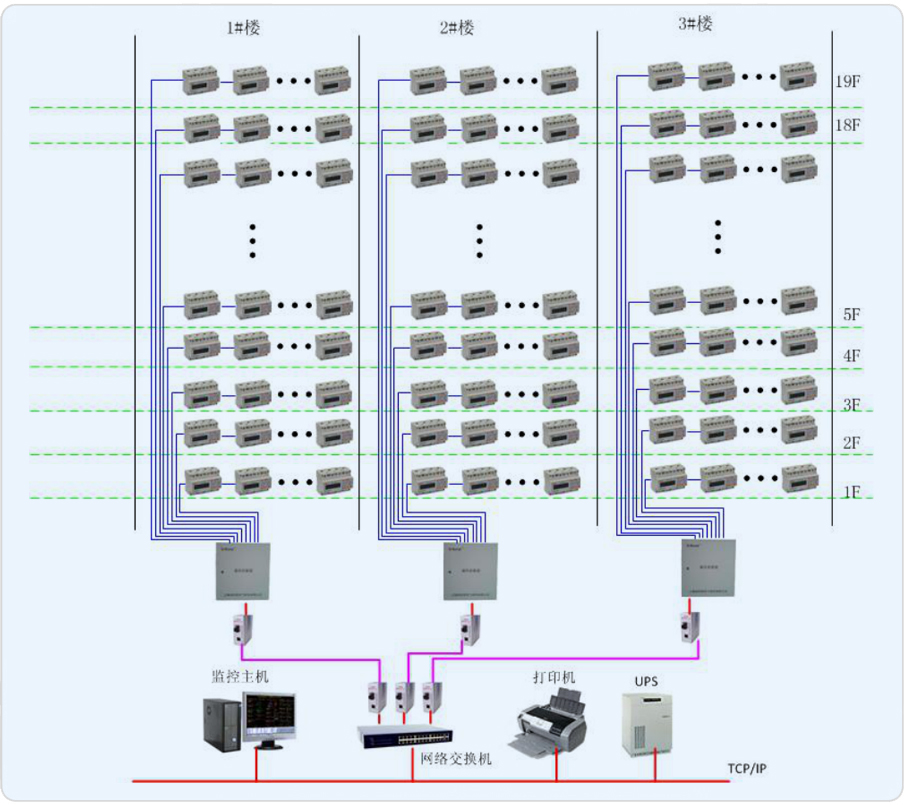 項目對黃金時代大廈各動力箱、照明箱等終端配電箱內(nèi)各用電回路用電量進行電能管理,系統(tǒng)通過多功能的電能計量表計、通訊網(wǎng)絡(luò)和計算機軟件,實現(xiàn)各用電設(shè)備在運行過程中的實時數(shù)據(jù)采集、數(shù)據(jù)計算、數(shù)據(jù)統(tǒng)計、用電分析等,保證復(fù)雜供配電系統(tǒng)的安全可靠系數(shù),實現(xiàn)故障快速響應(yīng);掌握大廈能源消耗的成本結(jié)構(gòu),確保節(jié)能計劃和措施順利實施;科學(xué)、智能管理,提高效率,降低損耗,實現(xiàn)經(jīng)營成本優(yōu)化。系統(tǒng)由站控管理層、網(wǎng)絡(luò)通訊層和現(xiàn)場設(shè)備層構(gòu)成。系統(tǒng)要求盡量減少集中采集數(shù)據(jù)的裝置以保證系統(tǒng)的通訊可靠性。