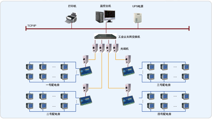 浦江雙輝大廈監(jiān)控部分有1個(gè)35kV配電室, 1#、2#、3#、4#、5#5個(gè)配電室分10kV高壓和0.4kV低壓。35kV配電室有高壓電力儀表、綜保和2臺(tái)變壓器溫控儀,另外5個(gè)配電室有10kV高壓電力儀表和綜保,0.4kV低壓部分有電力儀表和22臺(tái)變壓器溫控儀。35kV和1#配電室分布在A棟的B2層,2#配電室分布在B棟的B2層,3#配電室分布在A棟的33樓,4#配電室分布在B棟的33樓,5#配電室分布在A棟的B4層。針對(duì)浦江雙輝大廈的實(shí)際情況,通過(guò)計(jì)算機(jī)和通訊網(wǎng)絡(luò),將分散的配電所的現(xiàn)場(chǎng)設(shè)備連接為一個(gè)有機(jī)的整體,實(shí)現(xiàn)電網(wǎng)設(shè)備運(yùn)行的遠(yuǎn)程監(jiān)控和集中管理。