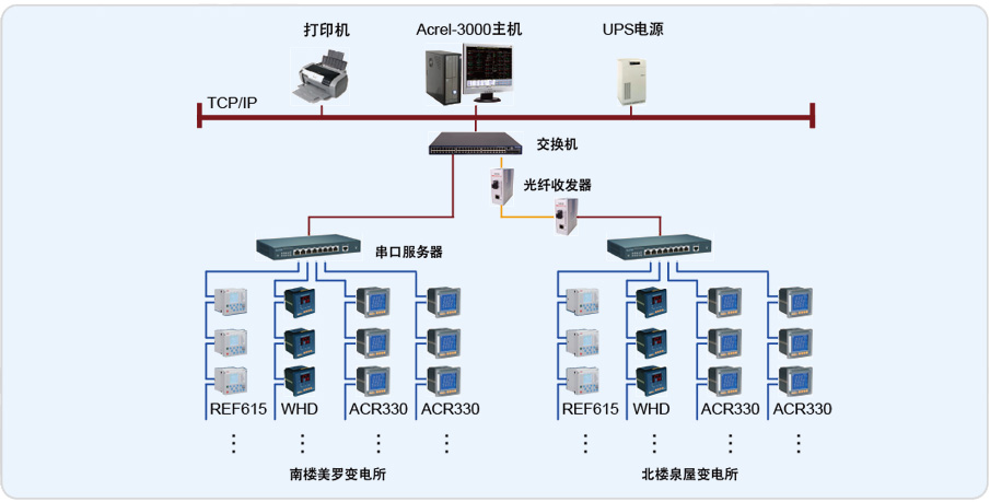 該系統總計有352只儀表(其中包括330只ACR網絡多功能電力儀表,12只ABB綜合保護裝置,10只變壓器溫控儀),分20條總線,其中北樓泉屋變電所8條總線,南樓美羅變電所12條總線,兩變電所之間距離較遠,采用光纖組網連接,再通過網線拉至南樓美羅變電所值班室連接到監控主機實現總線上儀表與監控主機的數據連通。