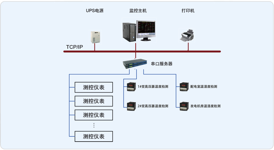 系統(tǒng)主要實(shí)現(xiàn)中國(guó)建設(shè)銀行股份有限公司云南分行本部地下B2變電所的0.4kV配電系統(tǒng)進(jìn)行用電監(jiān)測(cè)與電能管理;監(jiān)測(cè)范圍為改造變電所的T1、T2變壓器的饋線(xiàn)柜、母聯(lián)柜、電容補(bǔ)償柜,變壓器的相間溫度、配電室和發(fā)電機(jī)房的溫濕度,饋線(xiàn)柜和母聯(lián)柜側(cè)儀表進(jìn)行遠(yuǎn)程實(shí)時(shí)監(jiān)控和電能管理。該系統(tǒng)總計(jì)有29只儀表,分4條總線(xiàn),都是直接通過(guò)屏蔽雙絞線(xiàn)走管道拉至值班室后連接到串口服務(wù)器上,實(shí)現(xiàn)總線(xiàn)上儀表與監(jiān)控主機(jī)的數(shù)據(jù)連通。