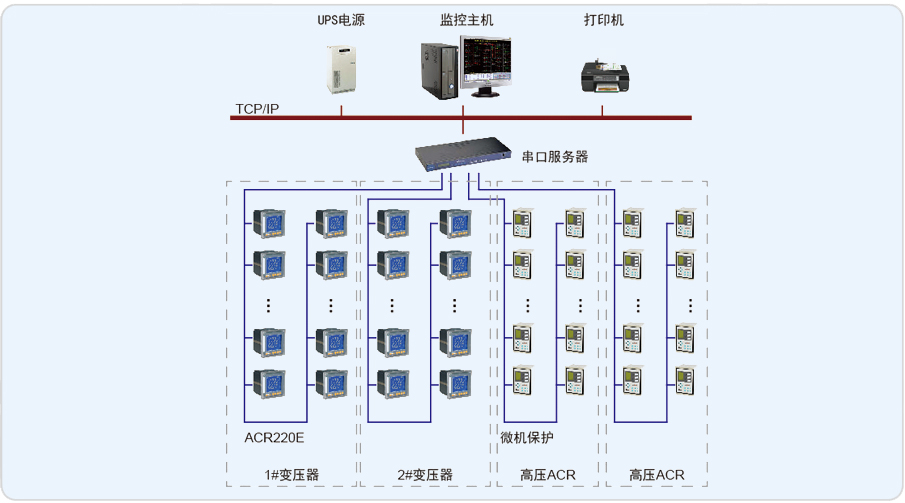 現場設備層設備為600臺電力儀表。這些設備分別根據設計要求安裝在相應的配電回路上。通過RS-485接口實現與上位機系統的數據交互。多功能表的通訊規約為Modbus-RTU;通訊管理層由2臺Nport-5630串口服務器構成。串口服務器將RS-485總線協議轉換為工業以太網協議,通過TCP/IP與站控管理層主機相連,構建數據鏈路。通訊管理層設備均安裝在電氣值班室的值班人員操作臺中,與站控管理層設備安裝在一起;站控管理層設備為華北工控主機、顯示器、HP打印機以及山特UPS電源,均安裝在電氣值班室的操作臺中。通過安裝在主機上的Acrel-2000電力監控系統軟件實現對現場儀表數據的采集、處理以及各種人機交互功能。