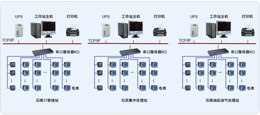本系統(tǒng)針對以上需要解決的問題,對石南31聯(lián)絡(luò)站、石西集中處理站和石南油田油氣處理站三個站進(jìn)行能耗管理系統(tǒng)改造,其中石南31聯(lián)絡(luò)站配置儀表78塊,石西集中處理站配置儀表35塊,石南油田油氣處理站配置儀表59塊,進(jìn)線回路采用ACR320ELH多功能顯示儀表,出線回路采用PZ72-E4/KC,每個站為單獨一套系統(tǒng)。系統(tǒng)采用分層分布式結(jié)構(gòu),監(jiān)測數(shù)據(jù)采集完成后上傳傳至各自站內(nèi)監(jiān)控值班監(jiān)控室。