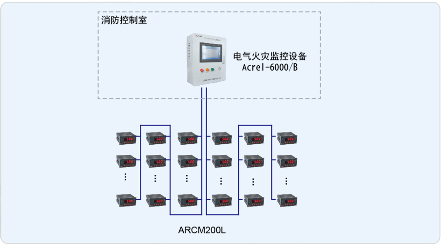 安科瑞于2014年9月承接了該項(xiàng)目電氣火災(zāi)監(jiān)控系統(tǒng),整套系統(tǒng)由壁掛式電氣火災(zāi)監(jiān)控裝置安科瑞Acrel-6000/B、ARCM200L剩余電流式火災(zāi)探測(cè)器組成。現(xiàn)場(chǎng)低壓配電柜內(nèi)探測(cè)器采用2條485總線(xiàn)接至消控中心的Acrel-6000/B壁掛式電氣火災(zāi)監(jiān)控系統(tǒng),當(dāng)現(xiàn)場(chǎng)保護(hù)線(xiàn)路中的被探測(cè)參數(shù)超過(guò)報(bào)警設(shè)定值時(shí),發(fā)出報(bào)警信號(hào)、控制信號(hào),指示報(bào)警部位并保存報(bào)警信息。