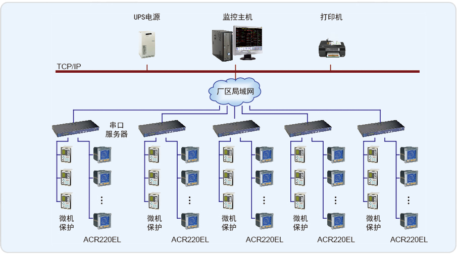 該系統(tǒng)總計有212只儀表(其中包括12只ACR230ELH、188只ACR220EL和12只ABB綜保),其中高壓室、發(fā)電機房、1#變電所的多功能儀表數(shù)據(jù)通過4根RS485總線直接上傳至監(jiān)控室;2#、3#變電所采用4根RS485總線,拉設至2#變電所通訊采集箱內(nèi),通過光纖上傳至監(jiān)控值班室;4#、5#變電所采用4根RS485總線,拉設至4#變電所通訊采集箱內(nèi),通過光纖上傳至監(jiān)控值班室,再通過工業(yè)網(wǎng)絡交換機將數(shù)據(jù)統(tǒng)一上傳至監(jiān)控主機。