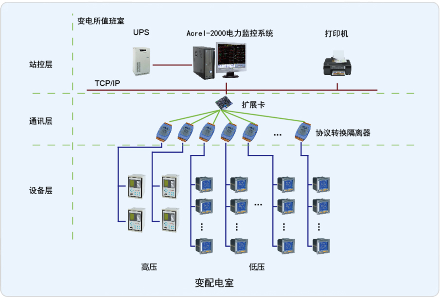 本項(xiàng)目承接其10KV配電增容改造變電所部分電力監(jiān)控系統(tǒng),其中有兩路高壓進(jìn)線,配有綜合保護(hù)裝置,低壓部分,進(jìn)線柜、饋線柜配有儀表。通過Acrel-2000電力監(jiān)控系統(tǒng),實(shí)時(shí)監(jiān)測變電所內(nèi)各個(gè)回路的電流、電壓、功率、開關(guān)狀態(tài)等電參量,由此達(dá)到變電所少人值守或無人值守的智能化管理。