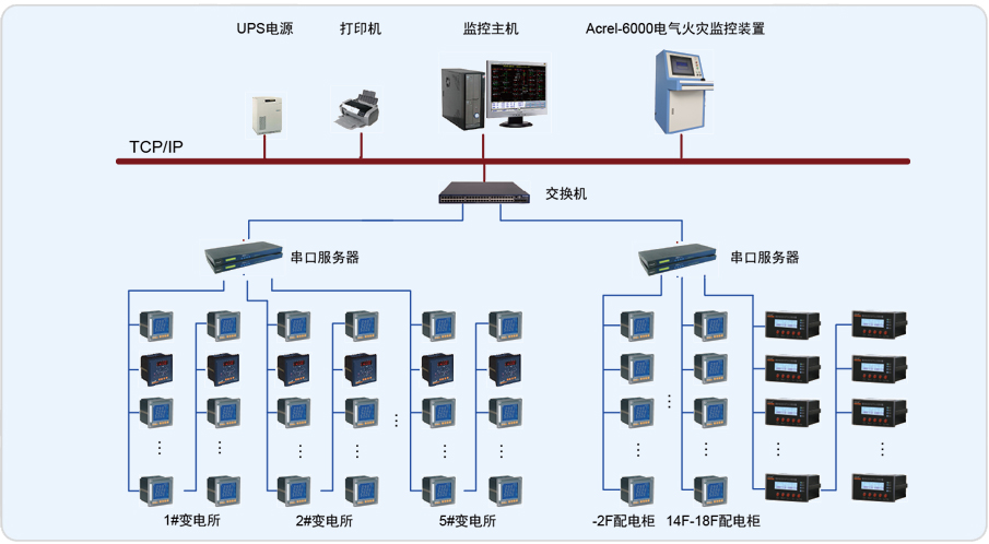 本項(xiàng)目采用Acrel-6000電氣火災(zāi)監(jiān)控系統(tǒng),監(jiān)控范圍主要為處于地下室的低壓配電間和各個(gè)樓層中的配電柜。客戶系統(tǒng)需求為探測(cè)漏電電流、過(guò)電流、超溫度等信號(hào),發(fā)出聲光信號(hào)報(bào)警,準(zhǔn)確報(bào)出故障線路地址,監(jiān)視故障點(diǎn)的變化。儲(chǔ)存各種故障和操作試驗(yàn)信號(hào),顯示系統(tǒng)電源狀態(tài)。