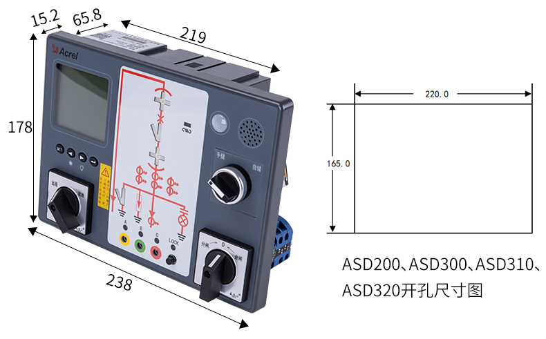 ASD系列開關柜綜合測控裝置具有一次回路模擬圖及開關狀態指示、高壓帶電顯示、自動溫濕度控制、人體感應自動照明、語音提示、電參數測量及RS485通訊接口等功能,集操作、顯示于一體,直觀地體現柜內元件的工...