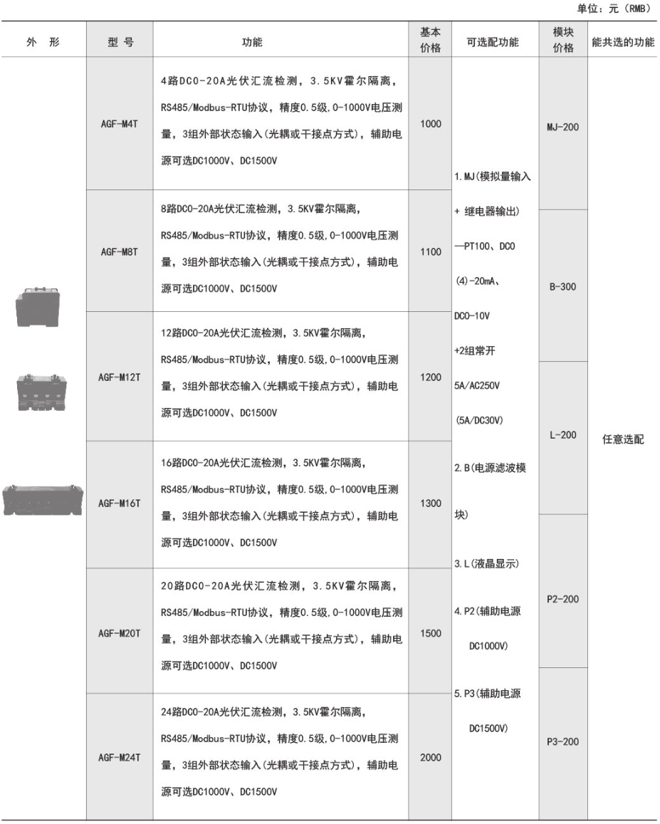 AGF-T穿孔式光伏匯流采集裝置是專門應(yīng)用于智能光伏匯流箱,用于監(jiān)測光電池陣列中電池板運行狀態(tài),組串電流測量,匯流箱中防雷器狀態(tài)采集、直流斷路器狀態(tài)采集、裝置帶有RS485接口可以把測量和采集到的數(shù)據(jù)...