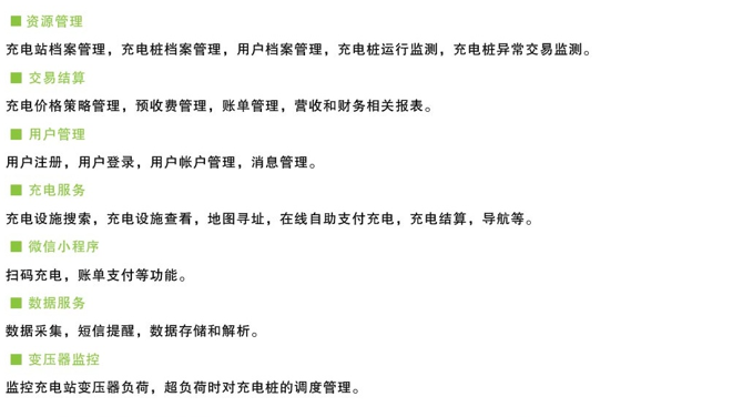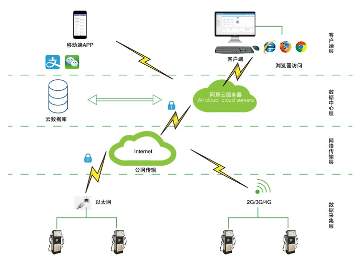 充電樁可選配WIFI模塊或GPRS模塊接入互聯(lián)網(wǎng),配合加密技術(shù)和秘鑰分發(fā)技術(shù),基于TCP/IP的數(shù)據(jù)交互協(xié)議,與云端進(jìn)行直連。云平臺(tái)包含了充電收費(fèi)和充電樁運(yùn)營(yíng)的所有功能,包括財(cái)務(wù)管理、變壓器監(jiān)控和運(yùn)營(yíng)分析等功能。
