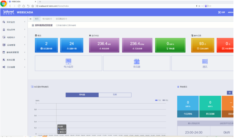 展示頁面顯示變電站數(shù)量、變壓器數(shù)量、監(jiān)測點位數(shù)量等概況信息,設備通信狀態(tài),用電分析和事件記錄。